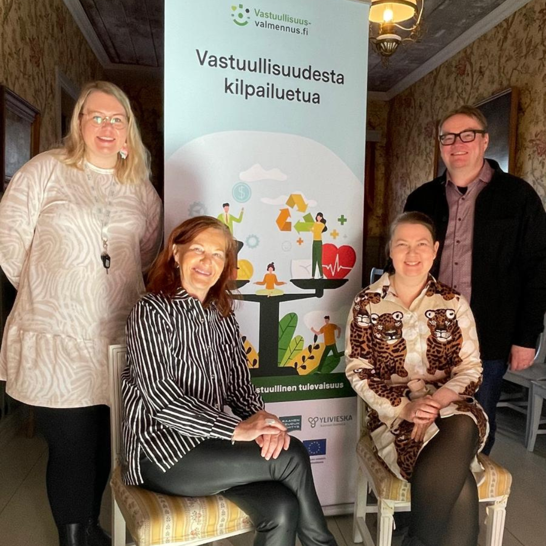 - Kaksi ryhmävalmennustyöpajaa, joissa aiheina mm. johdatus vastuullisuuteen, arvotyöskentely ja vastuullisuussuunnitelman teko